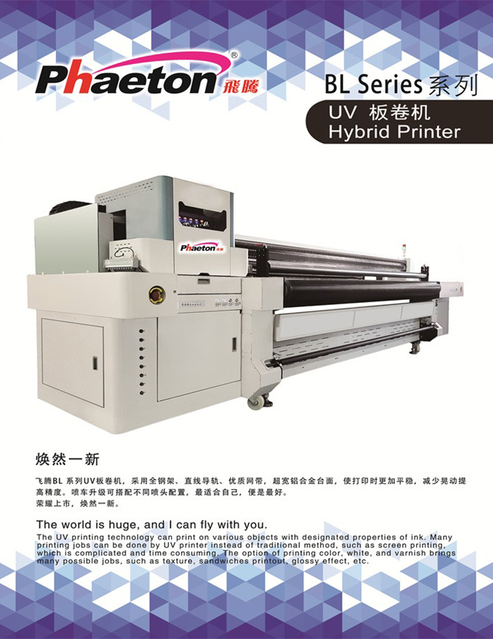 飛騰BL系列UV板卷機(jī),采用全鋼架、直線導(dǎo)軌、優(yōu)質(zhì)網(wǎng)帶,超寬鋁合金臺面,使打印時更加平穩(wěn),減少晃動提 高精度。噴車升級可搭配不同噴頭配置,最適合自己,便是最好。 榮耀上市,煥然一新。