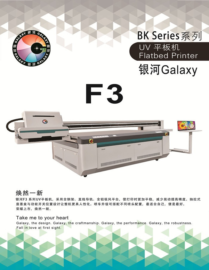 銀河F3系列UV平板機(jī),采用全鋼架、直線導(dǎo)軌、全鋁吸風(fēng)平臺,使打印時更加平穩(wěn),減少晃動提高精度。抽拉式廢墨盒與功能開關(guān)位置設(shè)計讓整機(jī)更具人性化。噴車升級可搭配不同噴頭配置,最適合自己,便是最好。 榮耀上市,煥然一新。