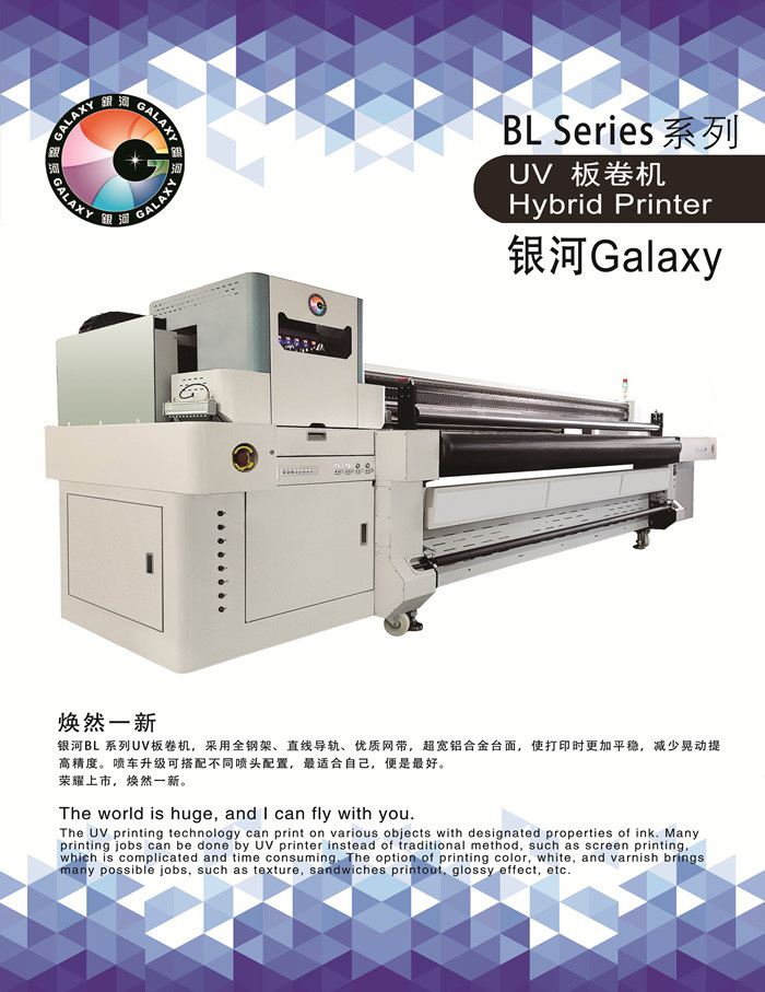 銀河BL系列UV板卷機(jī),采用全鋼架、直線導(dǎo)軌、優(yōu)質(zhì)網(wǎng)帶,超寬鋁合金臺面,使打印時更加平穩(wěn),減少晃動提 高精度。噴車升級可搭配不同噴頭配置,最適合自己,便是最好。 榮耀上市,煥然一新。